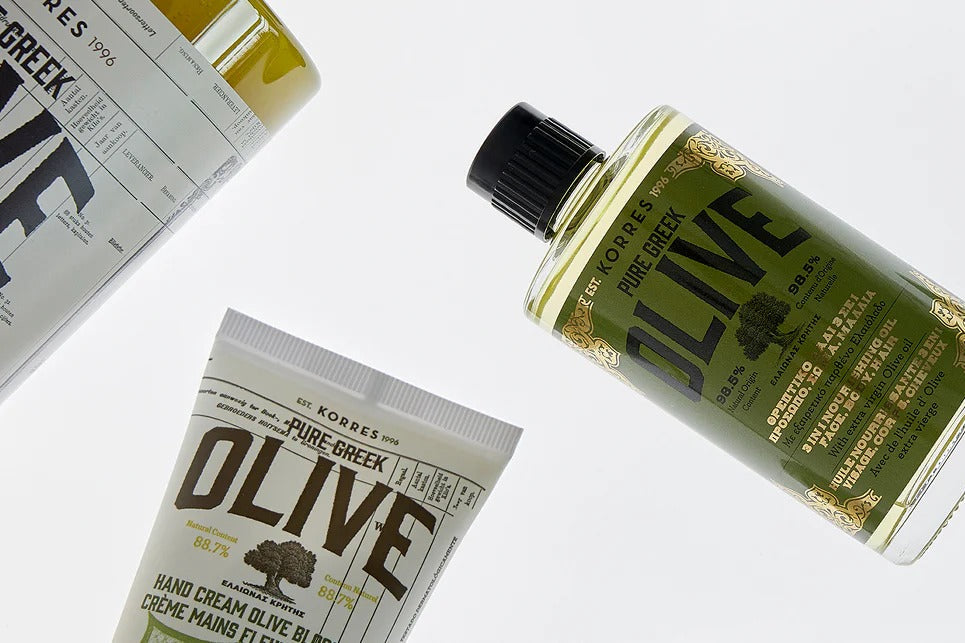 • Korres Pure Greek Olive shower gel bottle on a white background