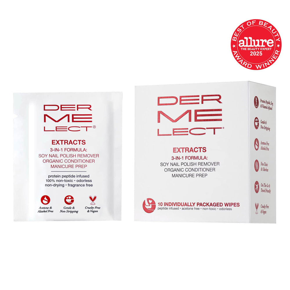 • Der Me Lect nail care product packaging with Allure award on a white background Extracts - 3-in-1 Soy Nail Polish Remover - 10 Pack